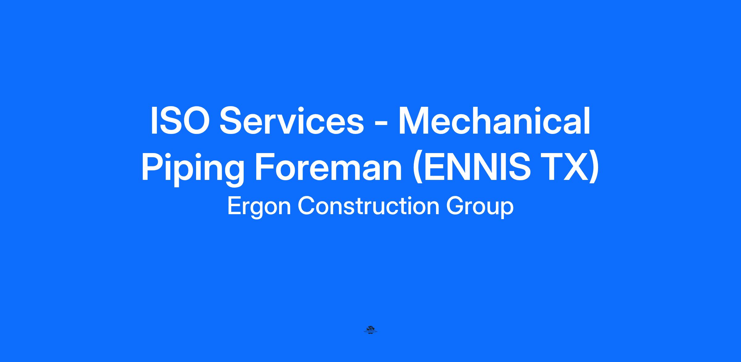 The Mechanical Piping Foreman position is a support position to ISO Services. The Pipe Foreman is responsible for supervision of fabrication, installation, and repair of piping, steel structure, and associated equipment, and for other activities involving ISO Services.
