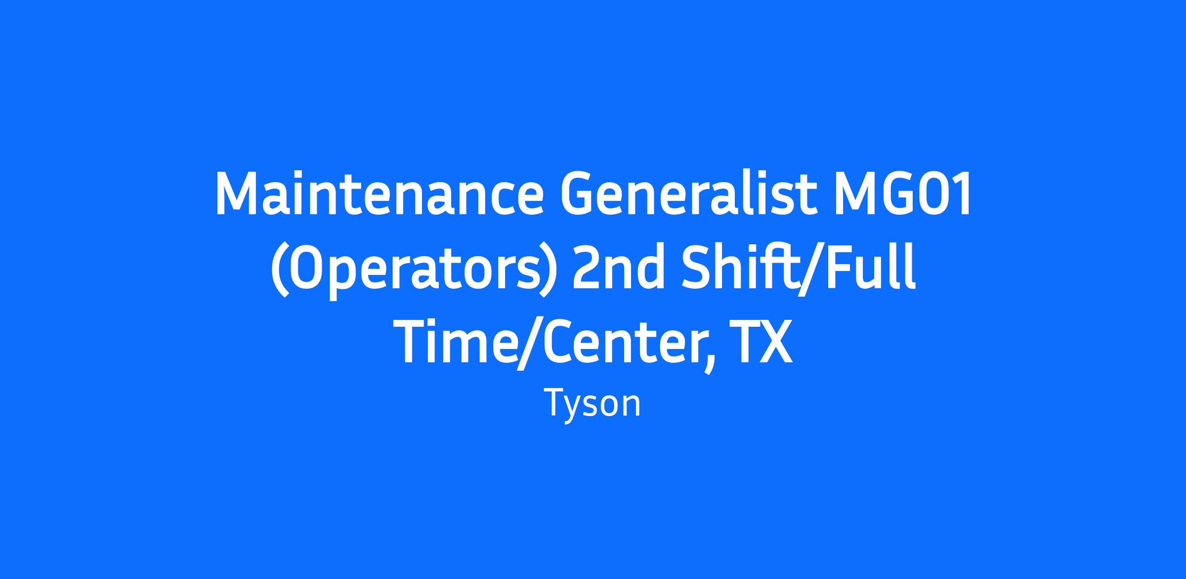 General Maintenance positions are responsible for keeping machinery running to maintain continuous production. You must be able to set up, adjust and break down production line machinery. Position requires knowledge in areas of welding, hydraulics, basic electricity, power transmission, pneumatics and other maintenance related areas. Must be able to learn Tyson SAP software to make work orders, fill out the daily documentation required, perform preventative maintenance routines as scheduled by Supervisor as well as confirm time into the SAP system to record daily activities and create equipment history. Must be able to read and write where required, must be able to communicate with management and co-workers as needed, must be able to process paperwork necessary to position, must be able to use math as needed to make work related computations for machinery, fluid capacities, etc. Must be willing to lift, push, pull up to 70 lbs, climb stairs and ladders on a daily basis, be willing to work in cold environments with temperatures ranging from -10 to 80 degrees in the production area to an environment that is tied to what the weather outside is (rain, heat, cold, insects), wet conditions, slippery floors in some areas, concrete floors and noise levels that are loud enough to require hearing protection and be willing to work on your feet for a period of 8 to 12 hours. Must be willing to complete all required training for the job.