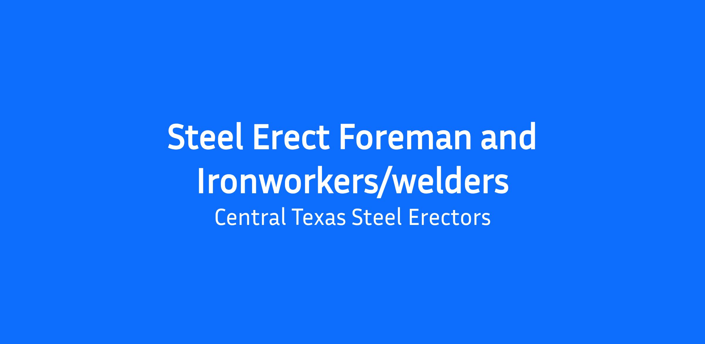 Join Central Texas Steel Erectors as a Steel Erect Foreman and Ironworker/Welder in Portland, TX! This exciting opportunity allows you to lead a dedicated team in the construction of high-quality steel structures while ensuring safety and efficiency on the job site.